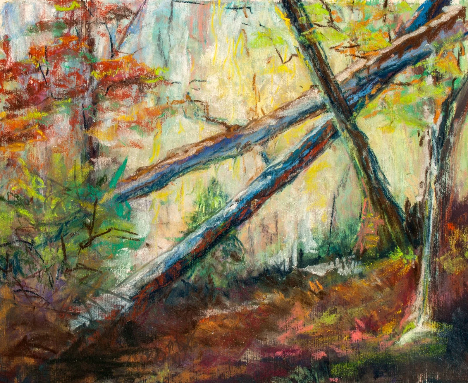 “My pastel painting, ‘Windstorm,’ is a composition I created using some observations of changes in the wooded area of my family farm. Much of my art is a reflection of memories and scenes of this farm in Adams County, especially the woodlands. I have noticed that the elms, ash, and some oak trees have all died from insects or diseases and are easy targets for strong winds that have become more frequent in the past decade. During walks in the woods I will almost always see downed trees or limbs – some hung up on a fence or another tree. These scenes make good compositions for my art, but at the same time make me frustrated because of the environmental loss.